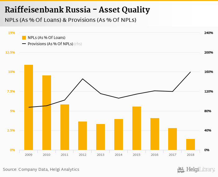 Comparing Raiffeisenbank Russia with its closest peers, Sberbank operated at the end of 2018 with NPL ratio of 3.75% and provision coverage of 189%, VTB Bank with 5.70% and 112% respectively and Alfa Bank had 3.38% of bad loans covered with 86.0% by provisions at the end of 2018.