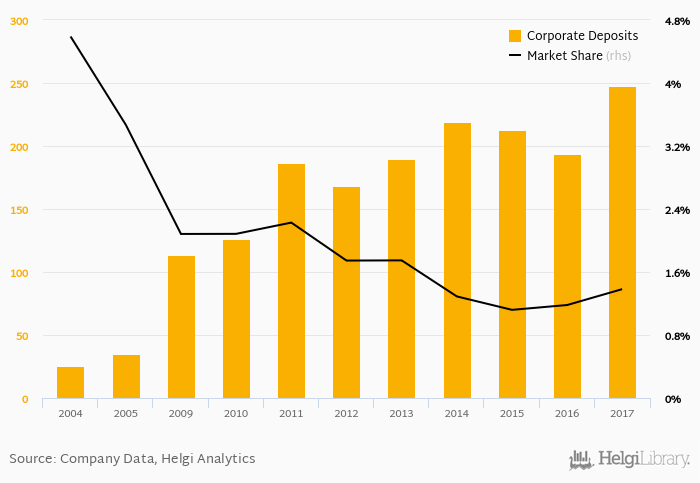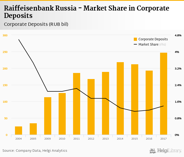 Raiffeisenbank Russia accounted for 1.38% of all corporate deposits taken by banks in Russia at the end of 2017. Historically, the bank’s market share in corporate deposits reached an all time high of 4.59% in 2004 and an all time low of 1.12% in 2015.