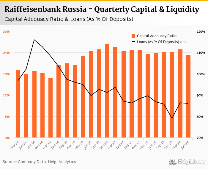 Raiffeisenbank Russia's capital adequacy ratio reached 23.4% at the end of second quarter of 2019, down from 25.0% when compared to the previous quarter. Historically, the bank’s capital ratio hit an all time high of 26.5% in 4Q2016 and an all time low of 17.0% in 1Q2015.