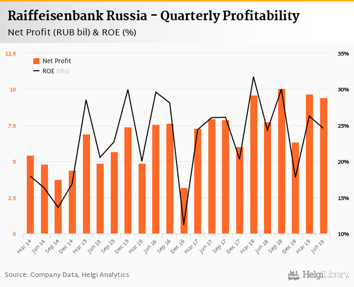 Raiffeisenbank Russia made a net profit of RUB 9.41 bil in the second quarter of 2019, up 21.4% when compared to the same period of last year. This implies a return on equity of 24.6%.