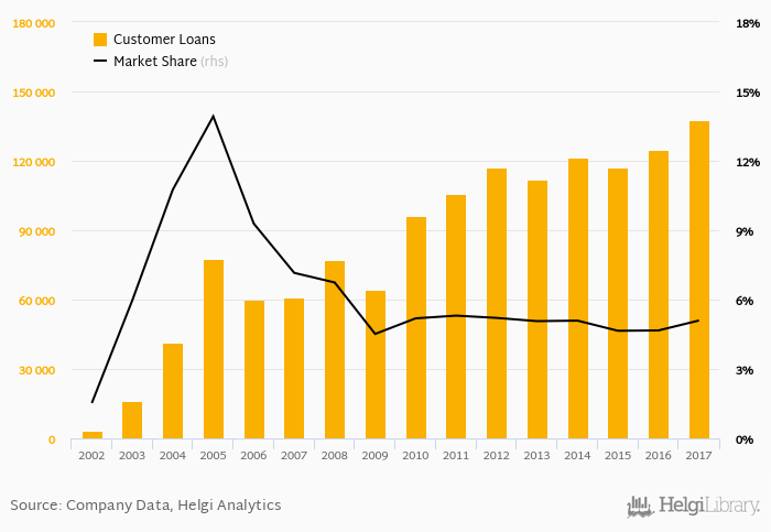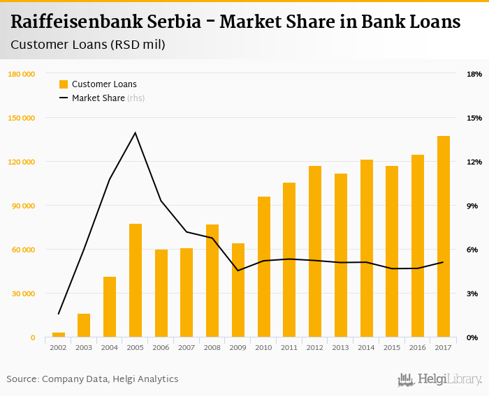 Raiffeisenbank Serbia accounted for 5.10% of all customer loans issued in Serbia at the end of 2017. Historically, the bank’s market share in customer loans reached an all time high of 13.9% in 2005 and an all time low of 1.53% in 2002.