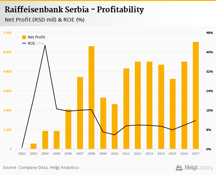 Comparing Raiffeisenbank Serbia with its closest peers, Komercijalna Banka Beograd generated a net profit of RSD 8,268 mil with ROE of 13.9% in 2017, Bank Intesa Serbia netted RSD 11,848 mil (ROE of 9.75%) and Societe Generale Serbia announced a net profit of RSD 6,325 mil implying ROE of 15.5%.