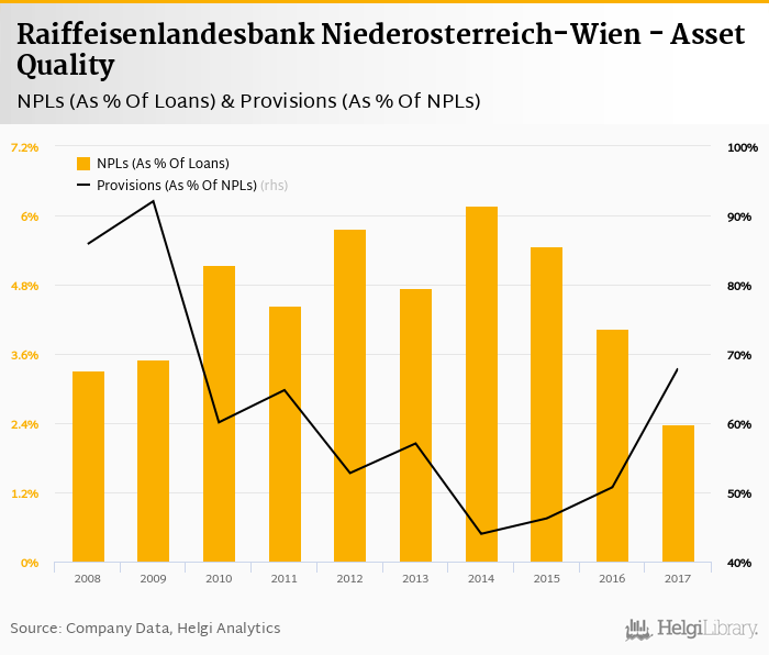 Raiffeisenlandesbank Niederosterreich-Wien's non-performing loans reached 2.38% of total loans at the end of 2017, down from 4.05% compared to the previous year. Historically, the NPL ratio hit an all time high of 6.16% in 2014 and an all time low of 2.38% in 2017.