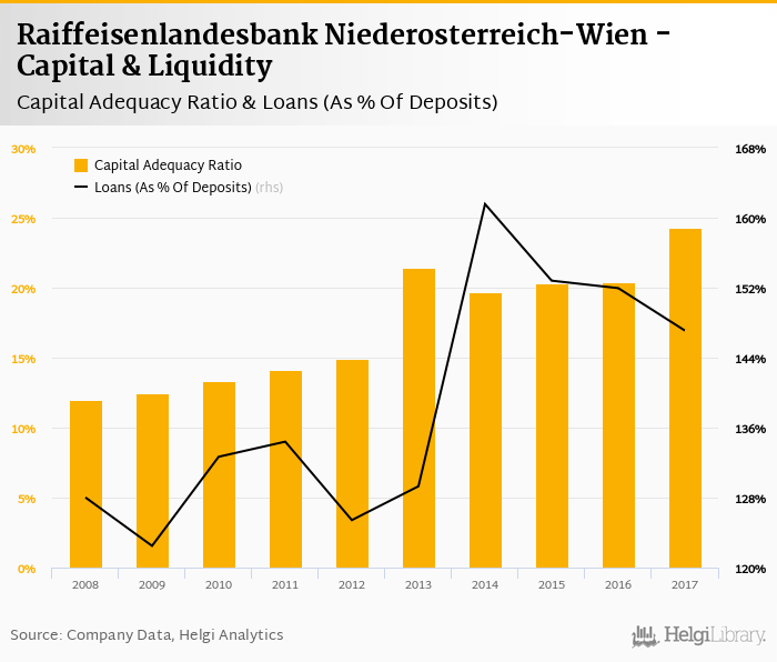 Raiffeisenlandesbank Niederosterreich-Wien's capital adequacy ratio reached 24.3% at the end of 2017, up from 20.4% compared to the previous year. Historically, the bank’s capital ratio hit an all time high of 24.3% in 2017 and an all time low of 12.0% in 2008.