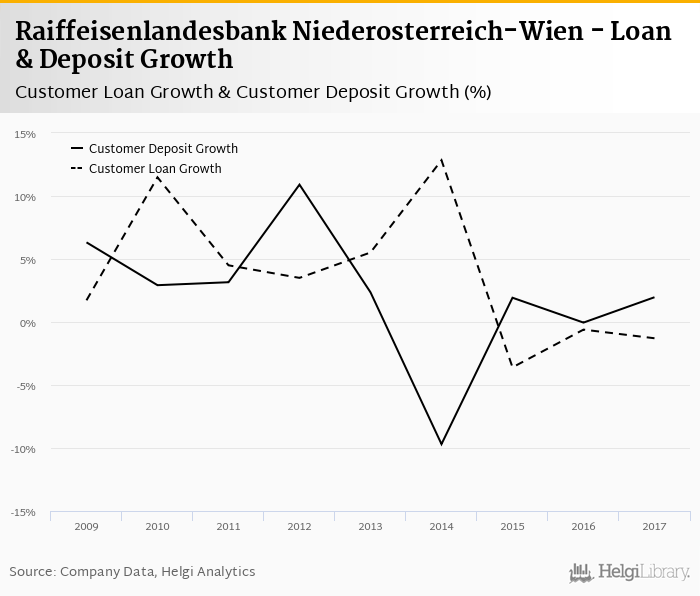 Raiffeisenlandesbank Niederosterreich-Wien's customer loan growth reached -1.29% in 2017, down from -0.605% compared to the previous year. Historically, the bank’s loans growth reached an all time high of 12.8% in 2014 and an all time low of -3.60% in 2015. In the last decade, the average annual loan growth amounted to 0%.