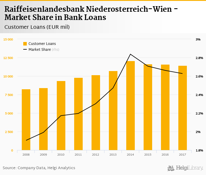 Raiffeisenlandesbank Niederosterreich-Wien accounted for 2.63% of all customer loans issued in Austria at the end of 2017. Historically, the bank’s market share in customer loans reached an all time high of 2.84% in 2014 and an all time low of 1.90% in 2008.
