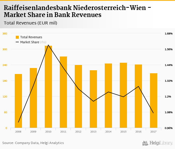 Raiffeisenlandesbank Niederosterreich-Wien generated total banking revenues of EUR 209 mil in 2017, down 13.6% compared to the previous year.