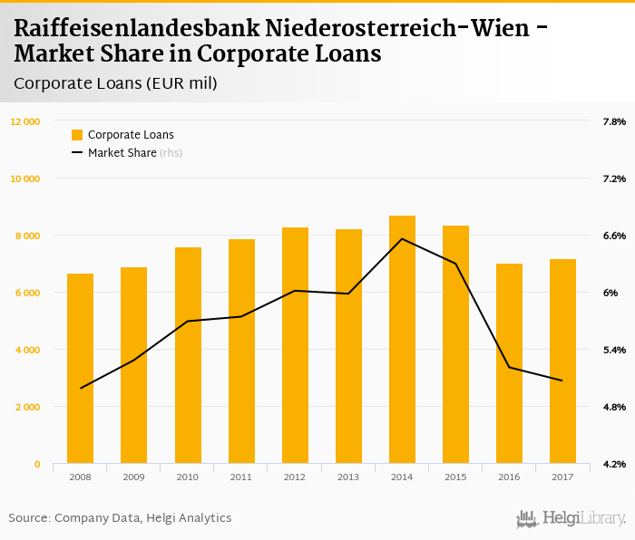 Raiffeisenlandesbank Niederosterreich-Wien accounted for 5.06% of all corporate loans issued in Austria at the end of 2017. Historically, the bank’s market share in corporate loans reached an all time high of 6.56% in 2014 and an all time low of 4.98% in 2008.