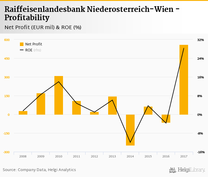 Raiffeisenlandesbank Niederosterreich-Wien made a net profit of EUR 559 mil in 2017, up 967% compared to the previous year. This implies a return on equity of 28.4%.