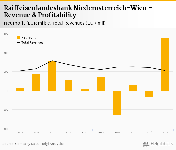 Raiffeisenlandesbank Niederosterreich-Wien made a net profit of EUR 559 mil under revenues of EUR 209 mil in 2017, up 967% and -13.6% respectively compared to the previous year.