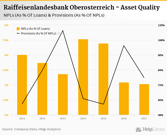 Raiffeisenlandesbank Oberosterreich's non-performing loans reached 3.09% of total loans at the end of 2017, down from 3.27% compared to the previous year. Historically, the NPL ratio hit an all time high of 7.60% in 2014 and an all time low of 3.09% in 2017.
