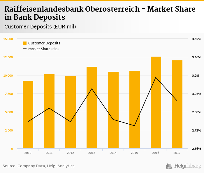 Raiffeisenlandesbank Oberosterreich accounted for 2.98% of all customer deposits taken by banks in Austria at the end of 2017. Historically, the bank’s market share in customer deposits reached an all time high of 3.18% in 2016 and an all time low of 2.76% in 2015.