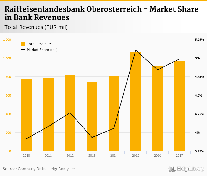 As a result, Raiffeisenlandesbank Oberosterreich accounted for 4.99% of all bank revenues generated by banks in Austria in 2017. Historically, the bank’s market share in total revenues reached an all time high of 5.10% in 2015 and an all time low of 3.91% in 2010.