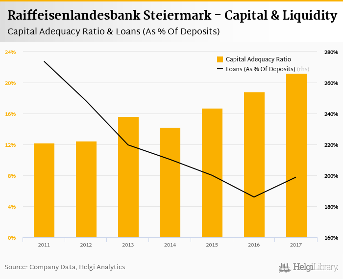 Raiffeisenlandesbank Steiermark's capital adequacy ratio reached 21.2% at the end of 2017, up from 18.8% compared to the previous year. Historically, the bank’s capital ratio hit an all time high of 21.2% in 2017 and an all time low of 12.2% in 2011.