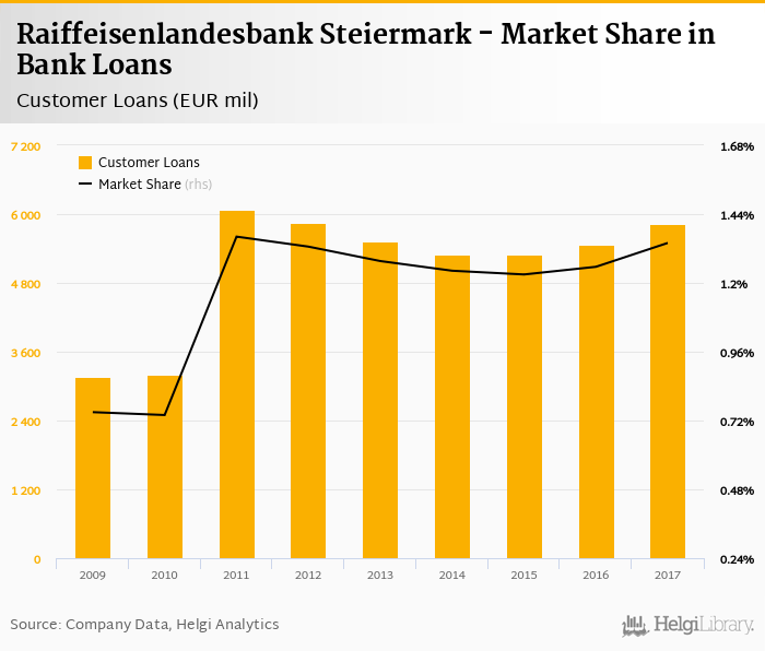 Raiffeisenlandesbank Steiermark accounted for 1.34% of all customer loans issued in Austria at the end of 2017. Historically, the bank’s market share in customer loans reached an all time high of 1.36% in 2011 and an all time low of 0.739% in 2010.
