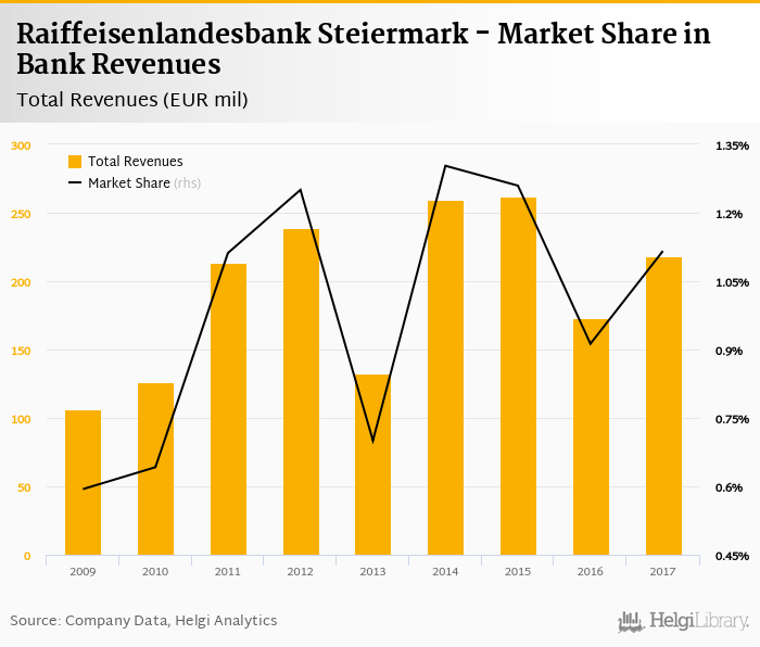 As a result, Raiffeisenlandesbank Steiermark accounted for 1.12% of all bank revenues generated by banks in Austria in 2017. Historically, the bank’s market share in total revenues reached an all time high of 1.30% in 2014 and an all time low of 0.594% in 2009.