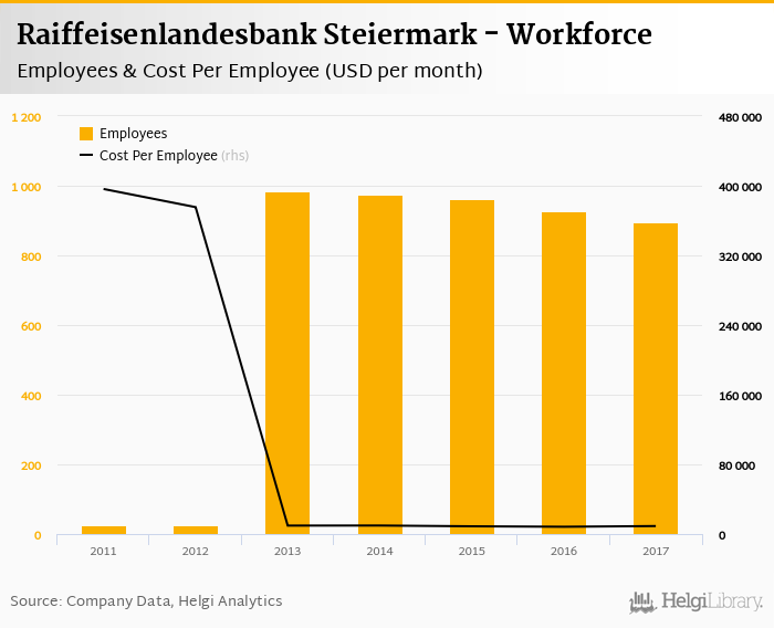 Raiffeisenlandesbank Steiermark employed 896 persons in 2017, down 3.24% when compared to the previous year. Historically, the bank's workforce hit an all time high of 983 persons in 2013 and an all time low of 25.0 in 2011.
