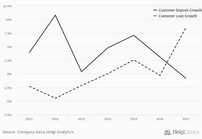 On the other hand, bank's customer deposit growth amounted to -0.854% at the end of 2017, down from 3.08% when compared to the previous year. Historically, the bank’s deposit growth reached an all time high of 10.8% in 2012 and an all time low of -0.854% in 2017. In the last decade, the average annual loan growth amounted to 0%.