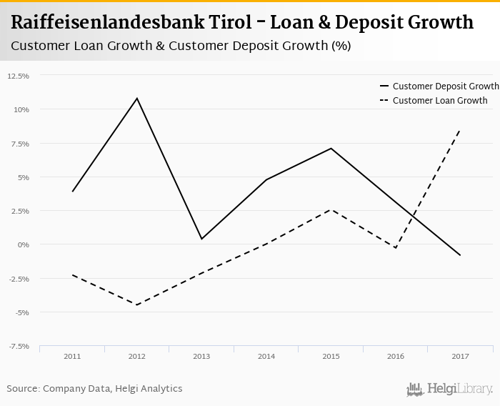 Raiffeisenlandesbank Tirol's customer loan growth reached 8.52% in 2017, up from -0.290% compared to the previous year. Historically, the bank’s loans growth reached an all time high of 8.52% in 2017 and an all time low of -4.51% in 2012. In the last decade, the average annual loan growth amounted to 0%.