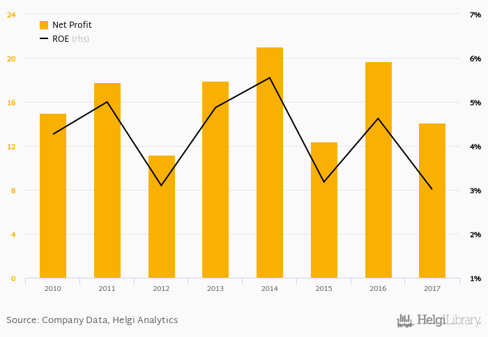 Historically, the bank’s net profit reached an all time high of EUR 21.0 mil in 2014 and an all time low of EUR 11.2 mil in 2012. The average profit in the last five years amounted to EUR 17.0 mil.
