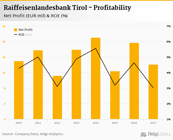 Raiffeisenlandesbank Tirol made a net profit of EUR 14.1 mil in 2017, down 28.4% compared to the previous year. This implies a return on equity of 3.01%.