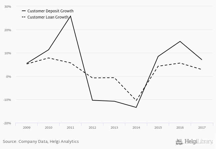 On the other hand, bank's customer deposit growth amounted to 7.01% at the end of 2017, down from 14.9% when compared to the previous year. Historically, the bank’s deposit growth reached an all time high of 25.7% in 2011 and an all time low of -13.4% in 2014. In the last decade, the average annual loan growth amounted to 0%.