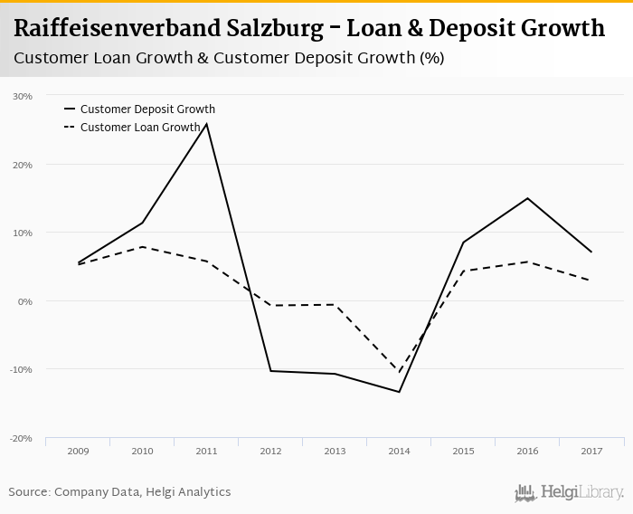 Raiffeisenverband Salzburg's customer loan growth reached 2.83% in 2017, down from 5.61% compared to the previous year. Historically, the bank’s loans growth reached an all time high of 7.80% in 2010 and an all time low of -10.5% in 2014. In the last decade, the average annual loan growth amounted to 0%.
