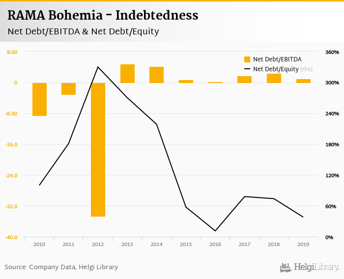 RAMA Bohemia's net debt stood at CZK 49.7 mil and accounted for 38.1% of equity at the end of 2019. The ratio is down 35.9 pp compared to the previous year.