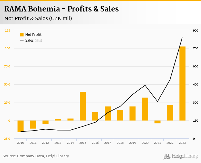 RAMA Bohemia made a net profit of CZK 103 mil in 2023, up 378% compared to the previous year. Total sales reached CZK 844 mil, which is up 73.2% when compared to the previous year.