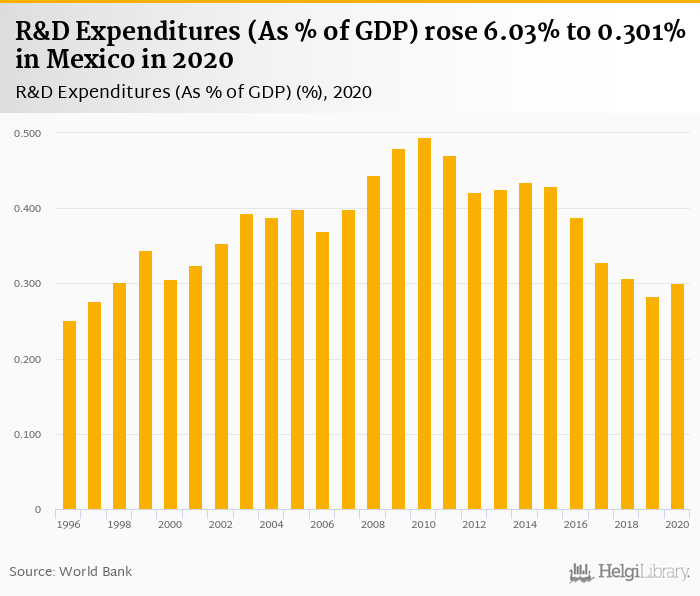 Historically, R&D expenditures as a percentage of GDP in Mexico reached an all time high of 0.474% in 2010 and an all time low of 0.238% in 1996.