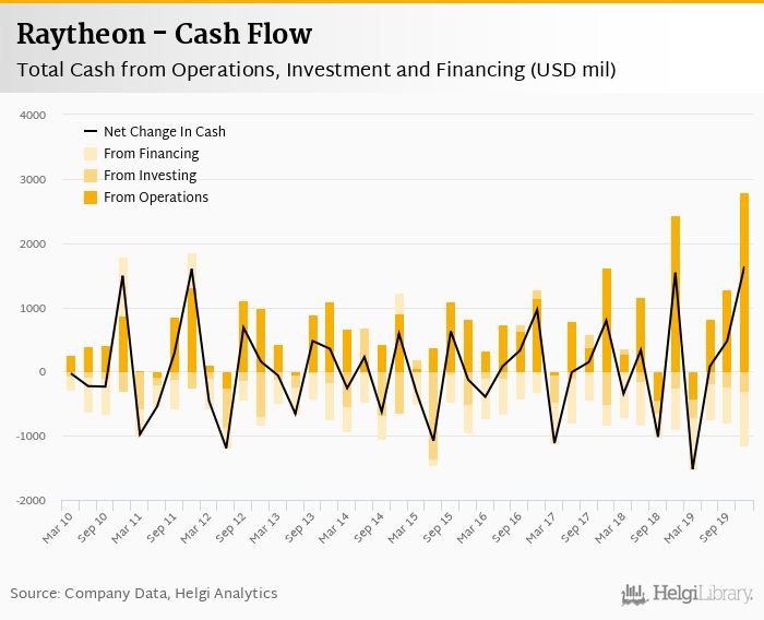 Raytheon's operating cash flow stood at USD 2,791 mil in 4Q2019, up 14.8% when compared to the previous year. Historically, between 1Q2010 - 4Q2019, the firm’s operating cash flow reached a high of USD 2,791 mil in 4Q2019 and a low of USD -444 mil in 3Q2018.