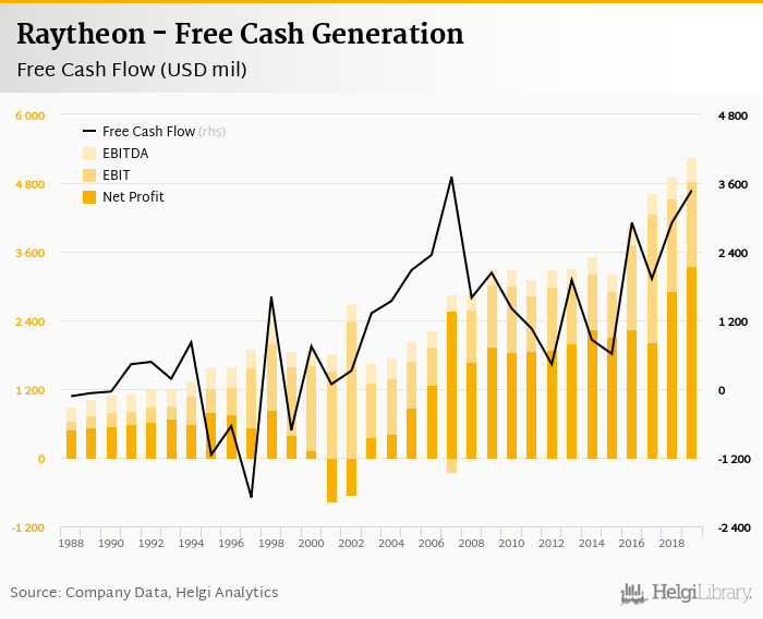 Raytheon made a net profit of USD 3,343 mil with revenues of USD 29,176 mil in 2019, up by 14.9% and up by 7.83%, respectively, compared to the previous year. This translates into a net margin of 11.5%.