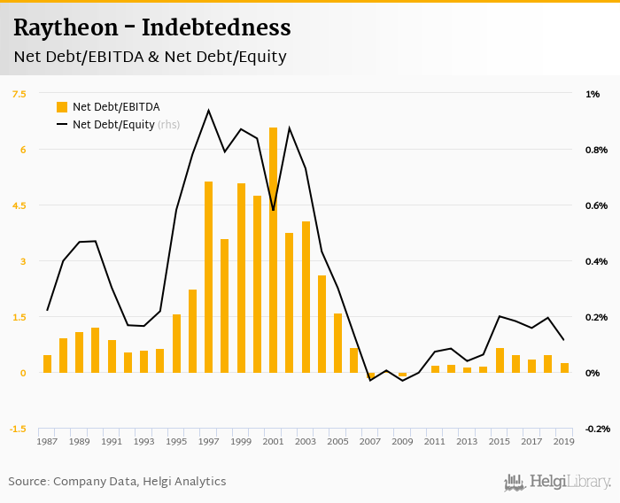 Raytheon's net debt stood at USD 1,387 mil and accounted for 0.113% of equity at the end of 2019. The ratio is down 0.081 pp compared to the previous year.