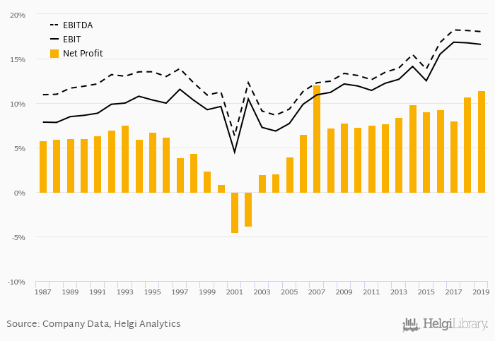 This translates into a net margin of 11.5%. Historically, between 1987 and 2019, the firm’s net margin reached a high of 12.1% in 2007 and a low of -4.52% in 2001. The average net margin in the last five years amounted to 9.71%.