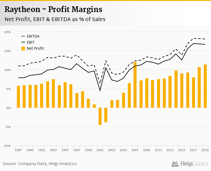 Raytheon made a net profit of USD 3,343 mil with revenues of USD 29,176 mil in 2019, up by 14.9% and up by 7.83%, respectively, compared to the previous year.