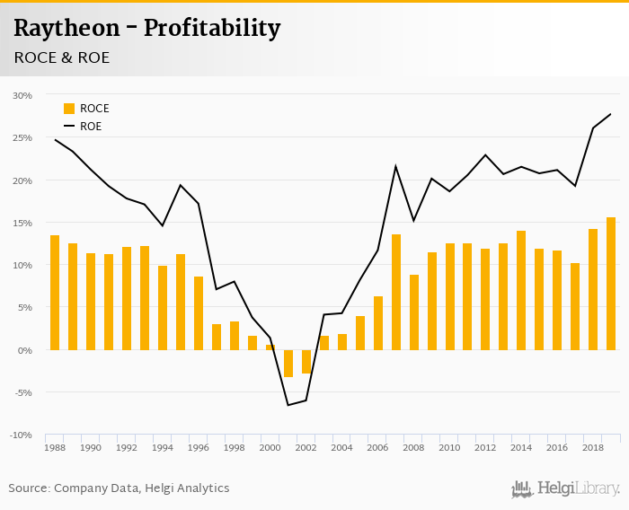 Raytheon made a net profit of USD 3,343 mil in 2019, up 14.9% compared to the previous year. Historically, between 1987 and 2019, the company's net profit reached a high of USD 3,343 mil in 2019 and a low of USD -763 mil in 2001.