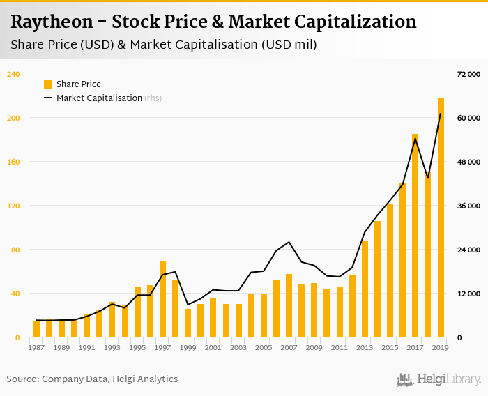 Raytheon stock traded at USD 218 per share at the end 2019 implying a market capitalization of USD 61,088 mil.