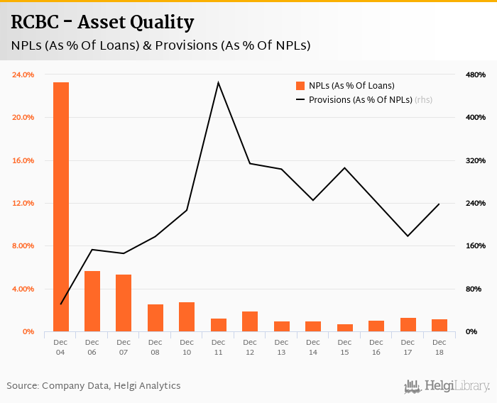 RCBC's non-performing loans reached 1.19% of total loans at the end of 2018-12-31, down from 1.33% compared to the previous year. Historically, the NPL ratio hit an all time high of 23.3% in 2004-12-31 and an all time low of 0.753% in 2015-12-31.