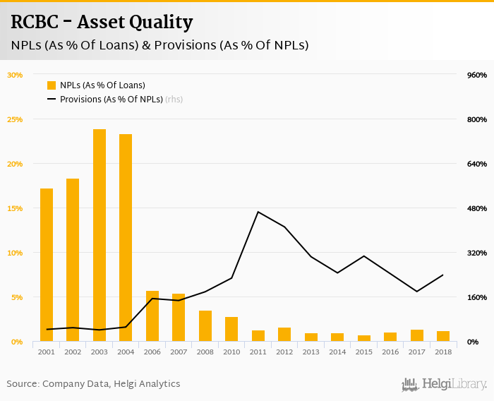 RCBC's non-performing loans reached 1.19% of total loans at the end of 2018, down from 1.33% compared to the previous year. Historically, the NPL ratio hit an all time high of 23.9% in 2003 and an all time low of 0.753% in 2015.