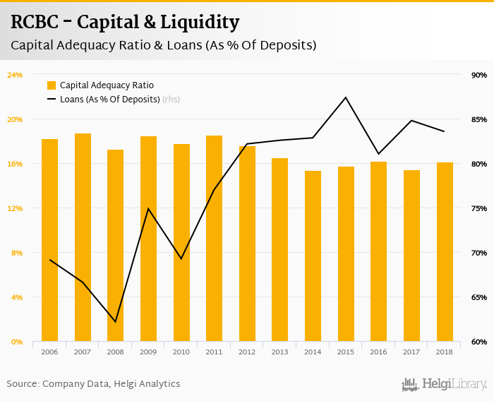 RCBC's capital adequacy ratio reached 16.1% at the end of 2018, up from 15.5% compared to the previous year. Historically, the bank’s capital ratio hit an all time high of 18.7% in 2007 and an all time low of 15.4% in 2014.