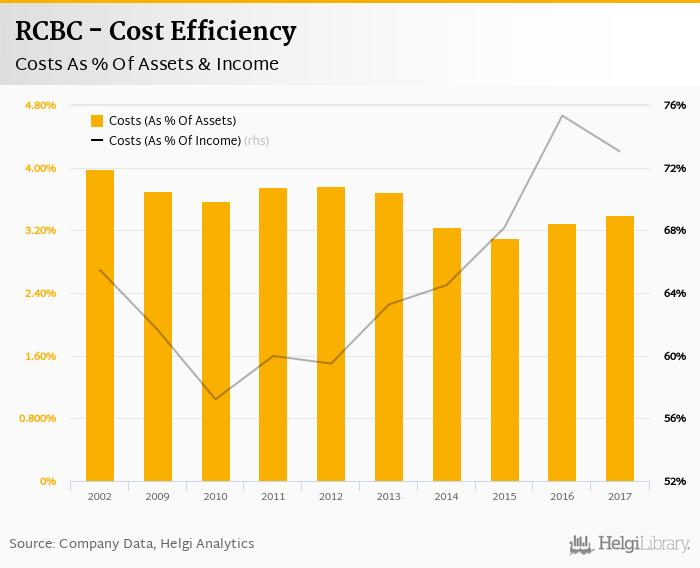 RCBC's cost to income ratio reached 73.0% in 2017, down from 75.3% compared to the previous year.