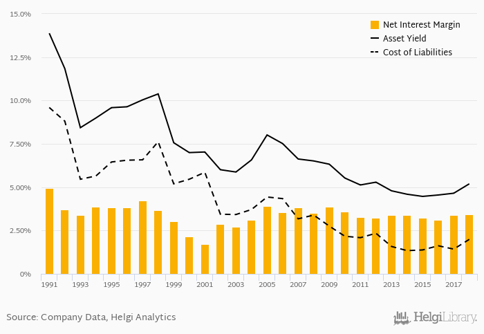 Historically, the bank’s net interest margin reached an all time high of 4.95% in 1991 and an all time low of 1.72% in 2001. The average margin in the last five years amounted to 3.32%.