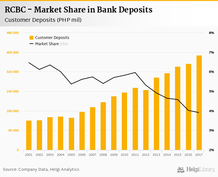 RCBC accounted for 3.91% of all customer deposits taken by banks in Philippines at the end of 2017. Historically, the bank’s market share in customer deposits reached an all time high of 6.47% in 2001 and an all time low of 3.91% in 2017.