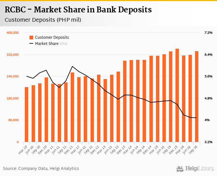 RCBC's customer deposits reached PHP 332,961 mil in 2016-09-30, up 4.11% compared to the previous year.