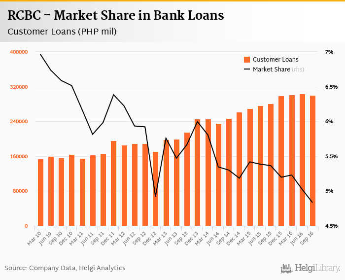 RCBC accounted for 4.83% of all customer loans issued in Philippines at the end of 2016-09-30. Historically, the bank’s market share in customer loans reached an all time high of 6.97% in 2010-03-31 and an all time low of 4.83% in 2016-09-30.