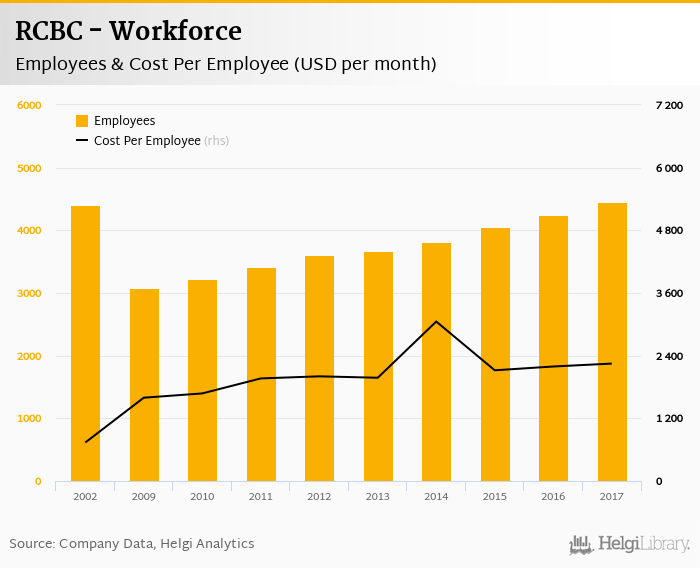 RCBC employed 4,454 persons in 2017, up 5.07% when compared to the previous year. Historically, the bank's workforce hit an all time high of 4,454 persons in 2017 and an all time low of 3,073 in 2009.