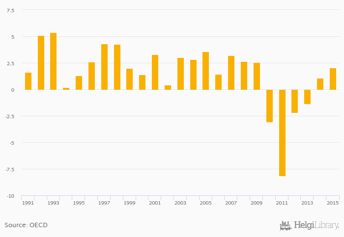 Real Gross Wage Growth rose 94.0% to 2.05% in Ireland in 2015, according to OECD.
