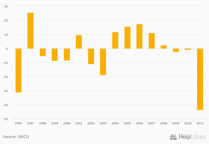 Historically, Real Gross Wage Growth in Venezuela reached an all time high of 25.4% in 1997 and an all time low of -43.6% in 2011.