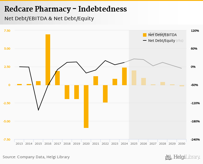 Redcare Pharmacy's net debt stood at EUR 69.8 mil and accounted for 13.7% of equity at the end of 2024. The ratio is up 7.60 pp compared to the previous year.