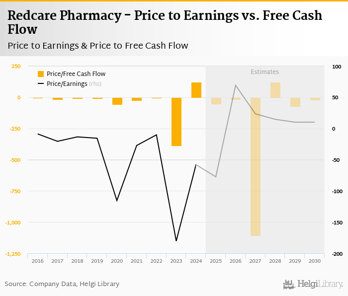 Regarding cash generated defined by the sum of net profit and depreciation, the stock traded at -96.4x at the end of 2024. When investments are excluded to get free cash flow, Redcare Pharmacy traded at 123x.